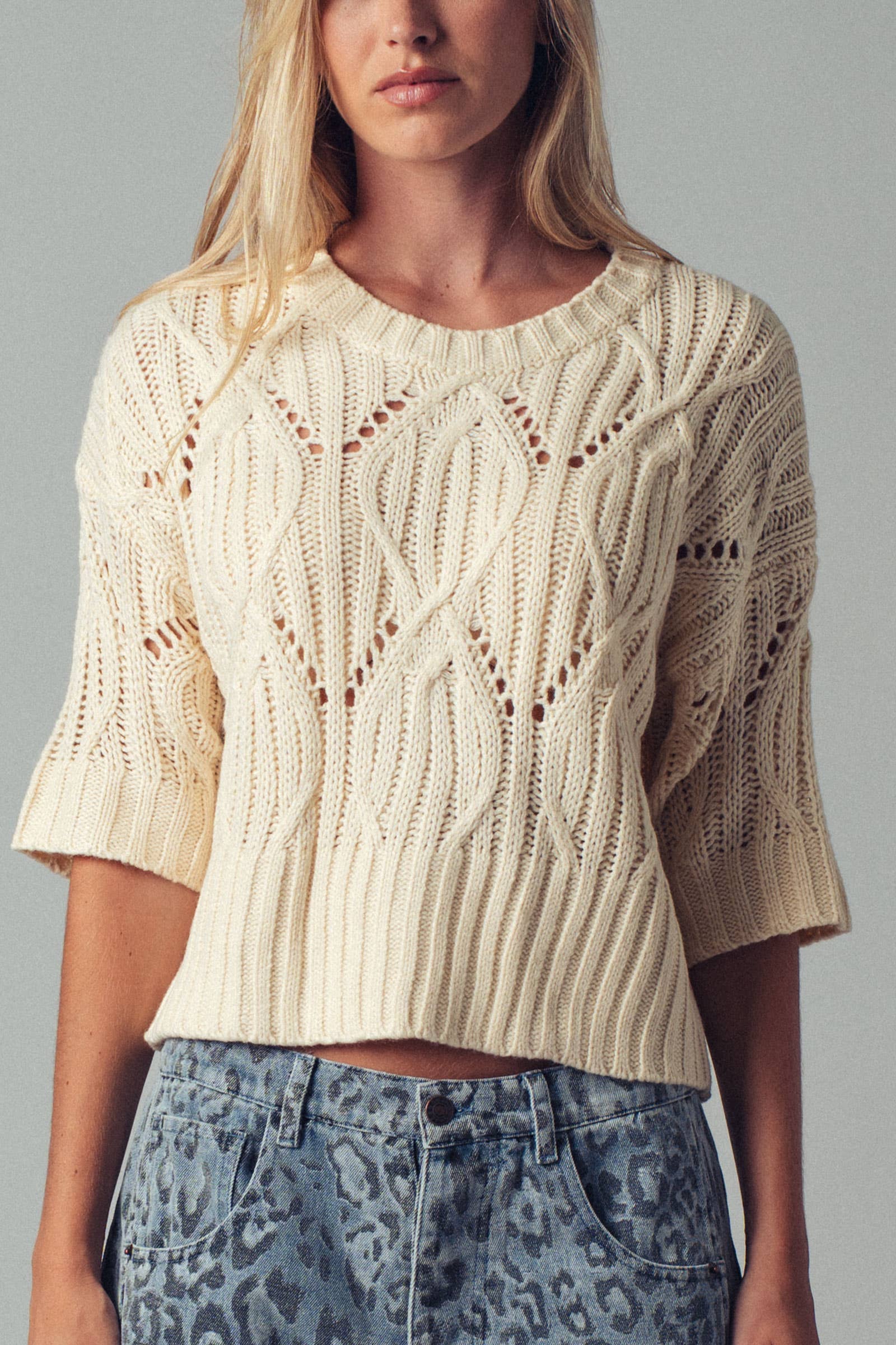 Embrace cozy sophistication with this intricately designed crochet sweater featuring a stunning cable knit pattern. The 3/4 length sleeves and ribbed trim create a flattering silhouette, while the crew neckline offers timeless appeal. Perfect for transitional weather and layered styling.