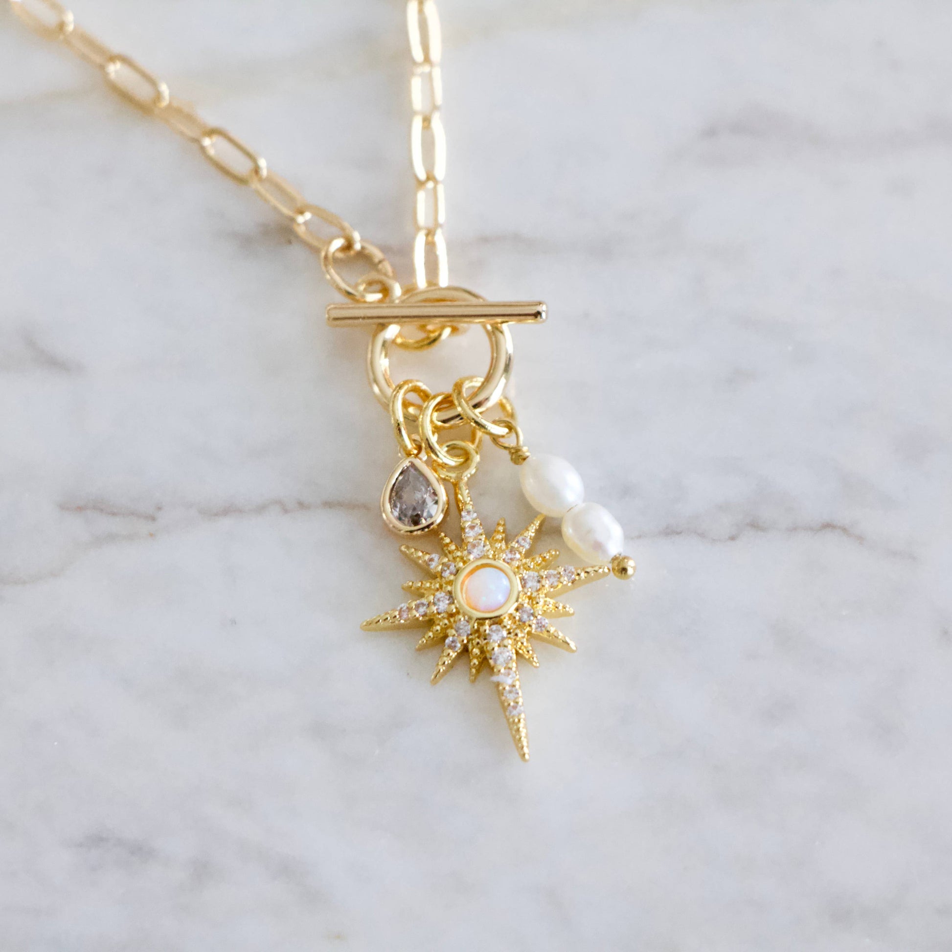CZ, Opal Star, Freshwater Pearl,Charm Toggle Necklace