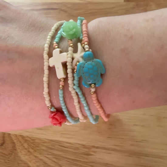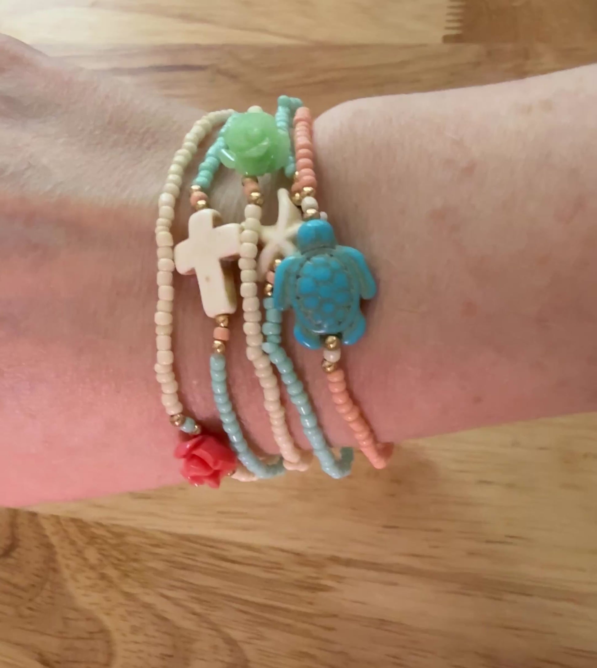Like little treasures gathered along the shoreline, the Seaside Treasure Charm Bracelet Set brings together soft coastal colors, delicate beads, and charming ocean-inspired details. Featuring playful charms like starfish, a sea turtle, and tiny blooms, each bracelet adds a touch of seaside magic to your everyday style.