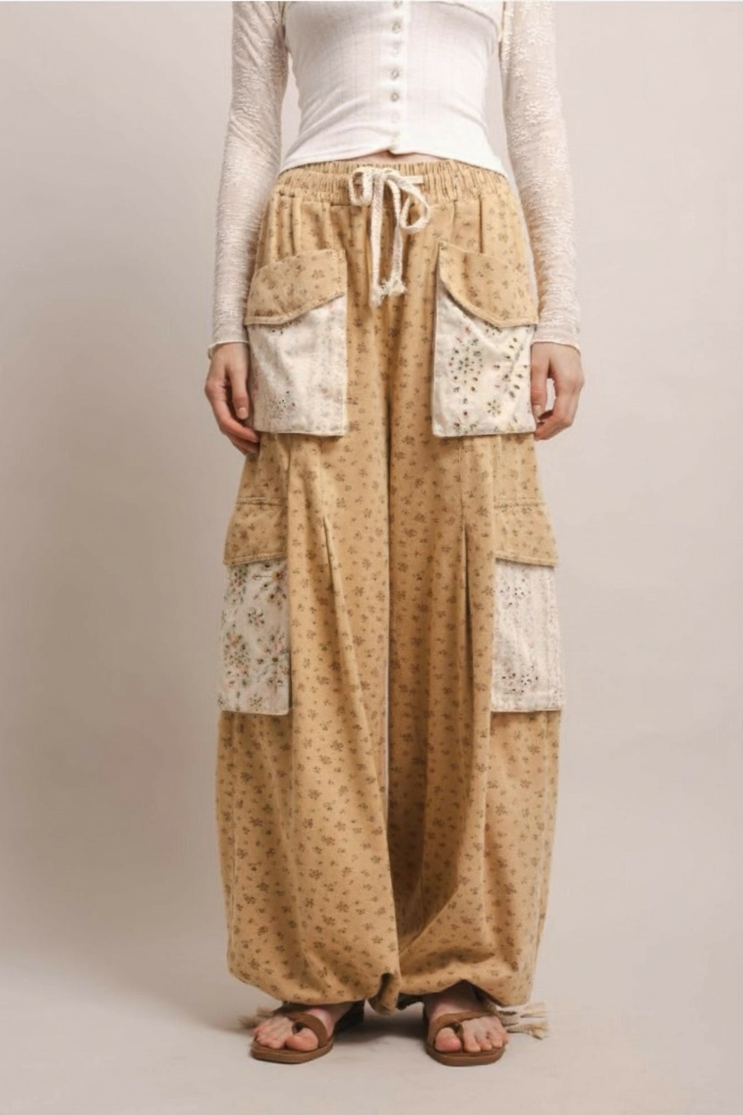These pants are a cottage core lovers dream. Delicate floral through the tan pant and the pockets have gorgeous multicolored floral print with eyelet detail speckled in. Draw string waist, they fit true to size with a wide leg fit. I’m a size 8 and wear the size medium for reference.